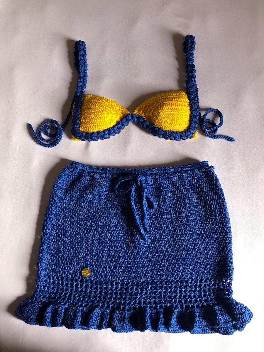 A combinação do azul intenso com amarelo vibrante traz modernidade e destaque, tornando o Conjunto Maré Brasil uma escolha perfeita para mulheres que amam moda artesanal de alto padrão.